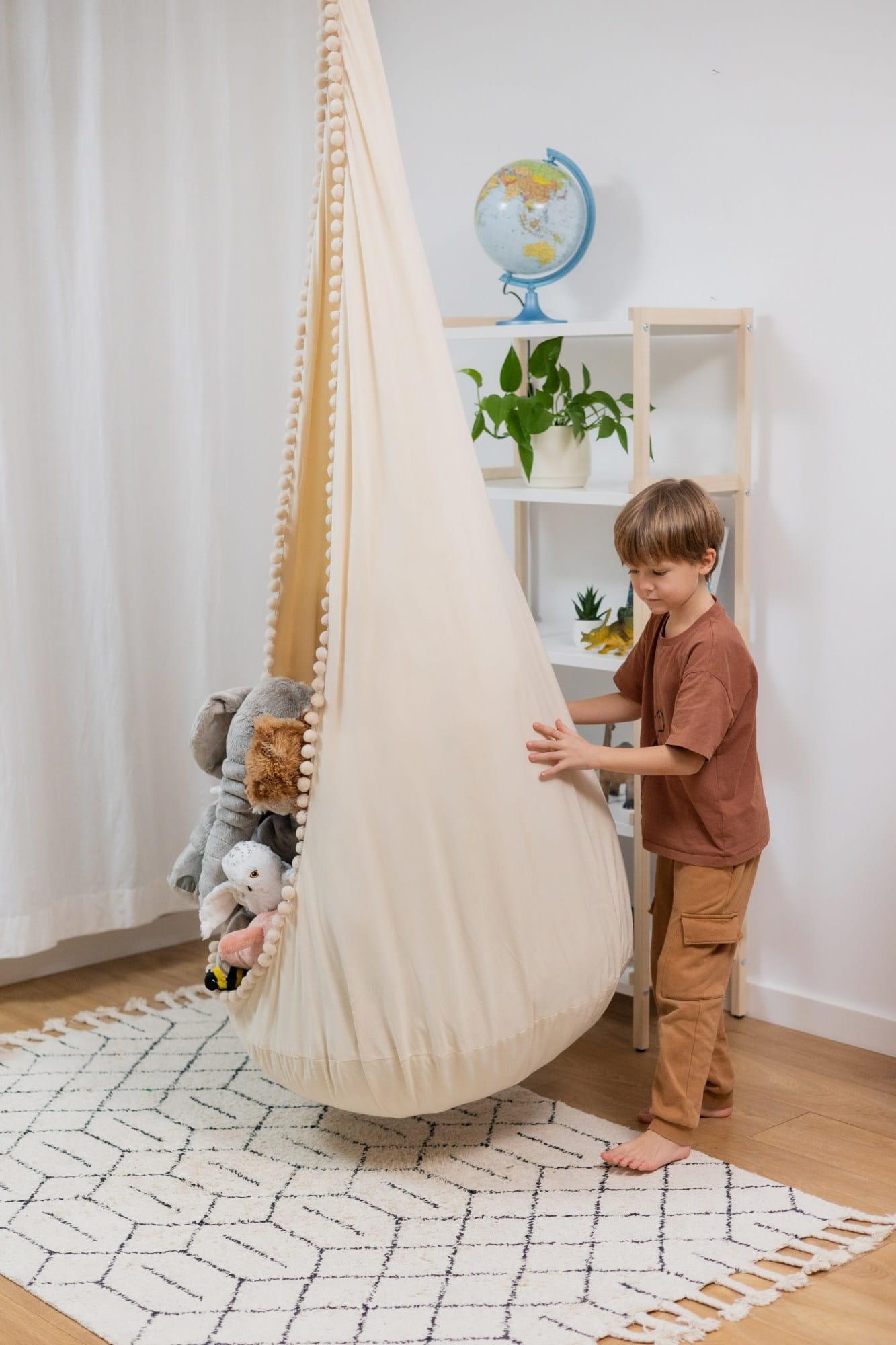 Możesz zawiesić kokon w pokoju dziecięcym, na balkonie, tarasie czy w ogrodzie. To nie tylko świetna zabawa, ale także sposób na rozwój motoryczny i sensoryczny dziecka!