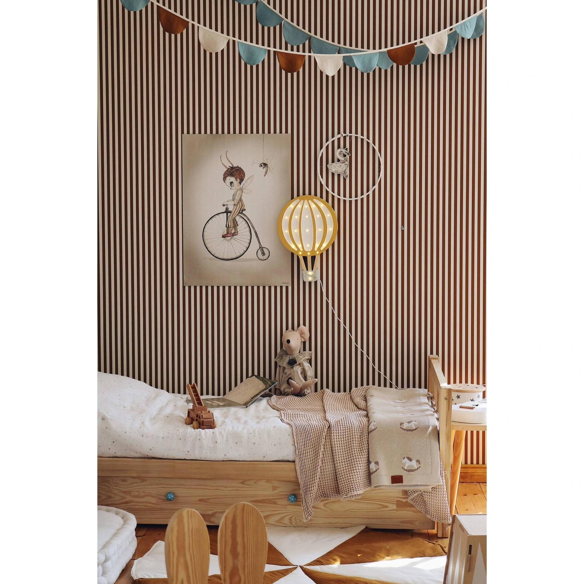 Zawieszona girlanda w pokoju dziecięcym nada wnętrzu niesamowitego charakteru.
