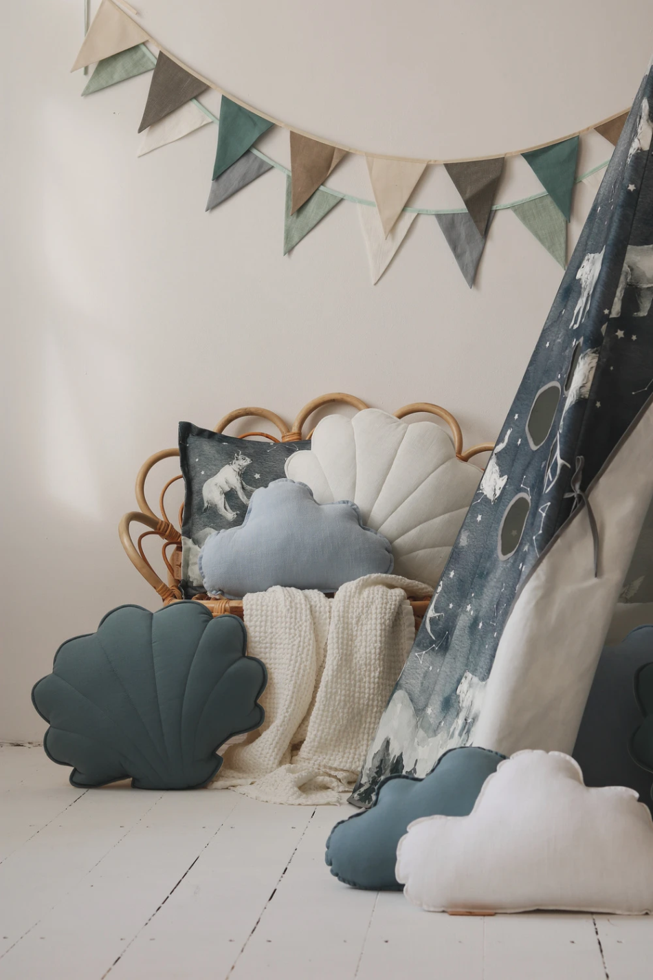Kładąc poduszki dekoracyjne na łóżko lub obok tipi podkreślisz niesamowity charakter pokoju dziecięcego.