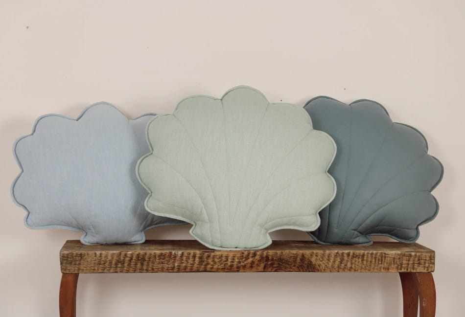 Poduszka lniana jest w kształcie muszli dostępnej w różnych wersjach kolorystycznych.