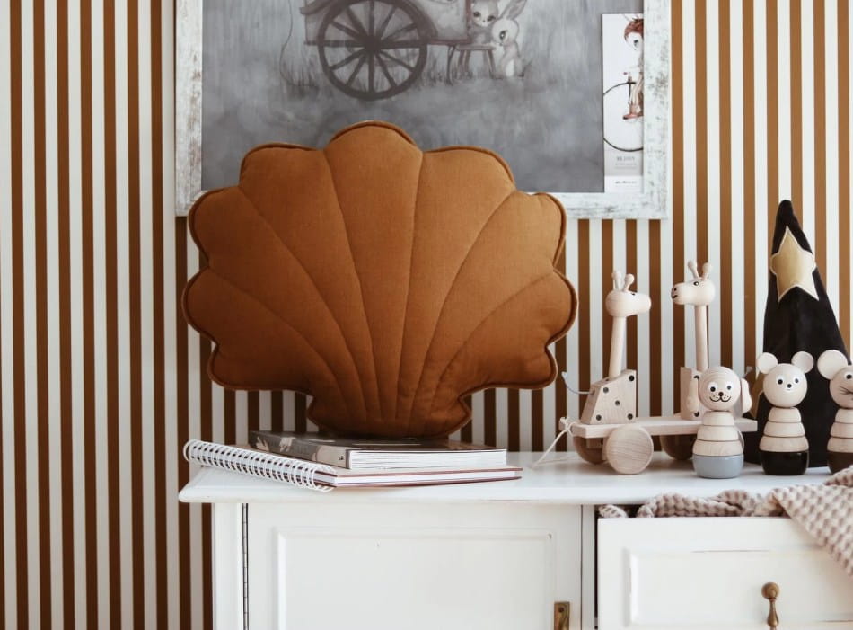 Poduszka lniana jest w kształcie muszli dostępnej w różnych wersjach kolorystycznych.
