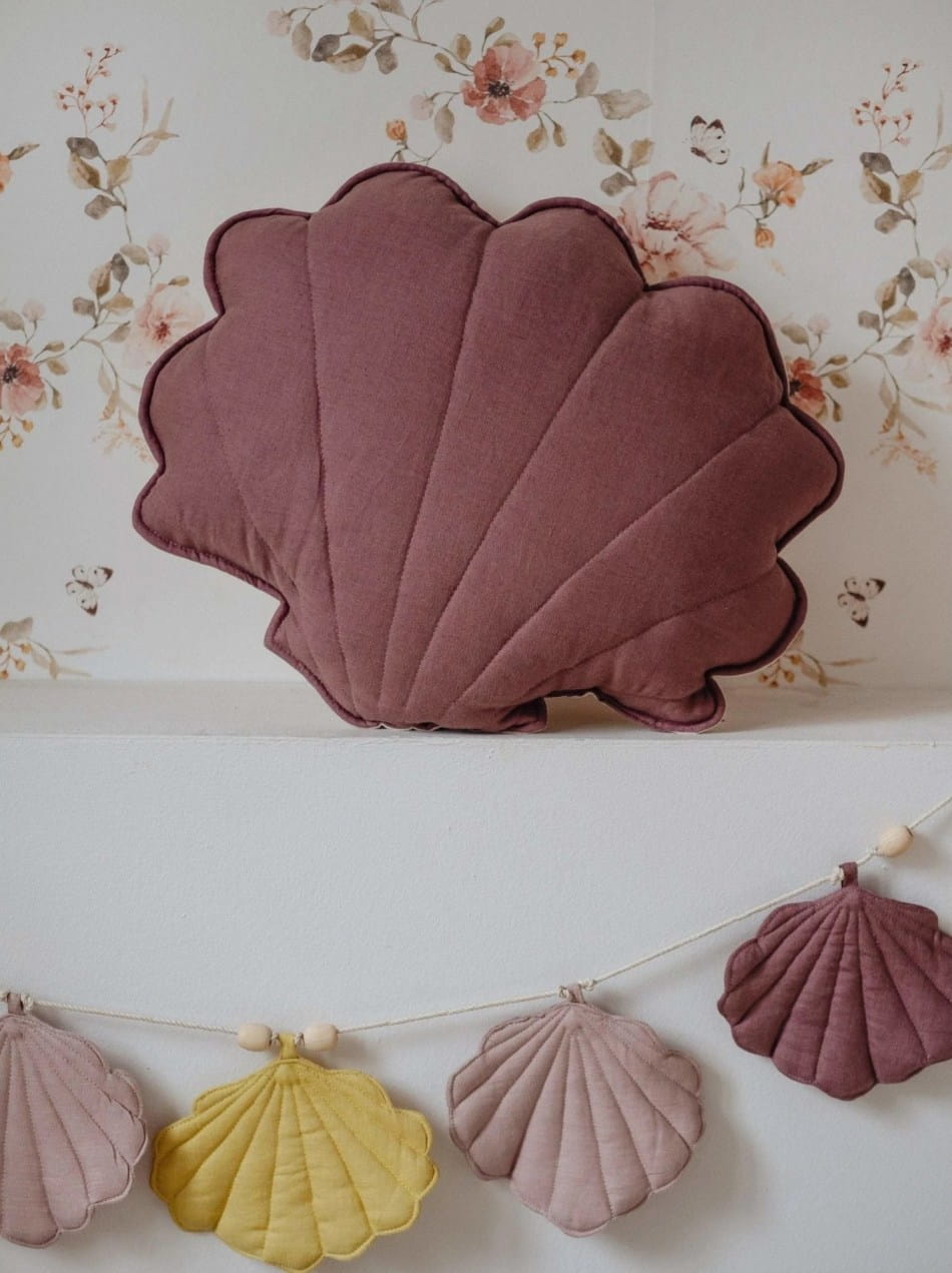 Poduszka lniana jest w kształcie muszli dostępnej w różnych wersjach kolorystycznych.