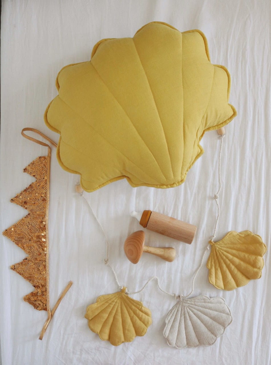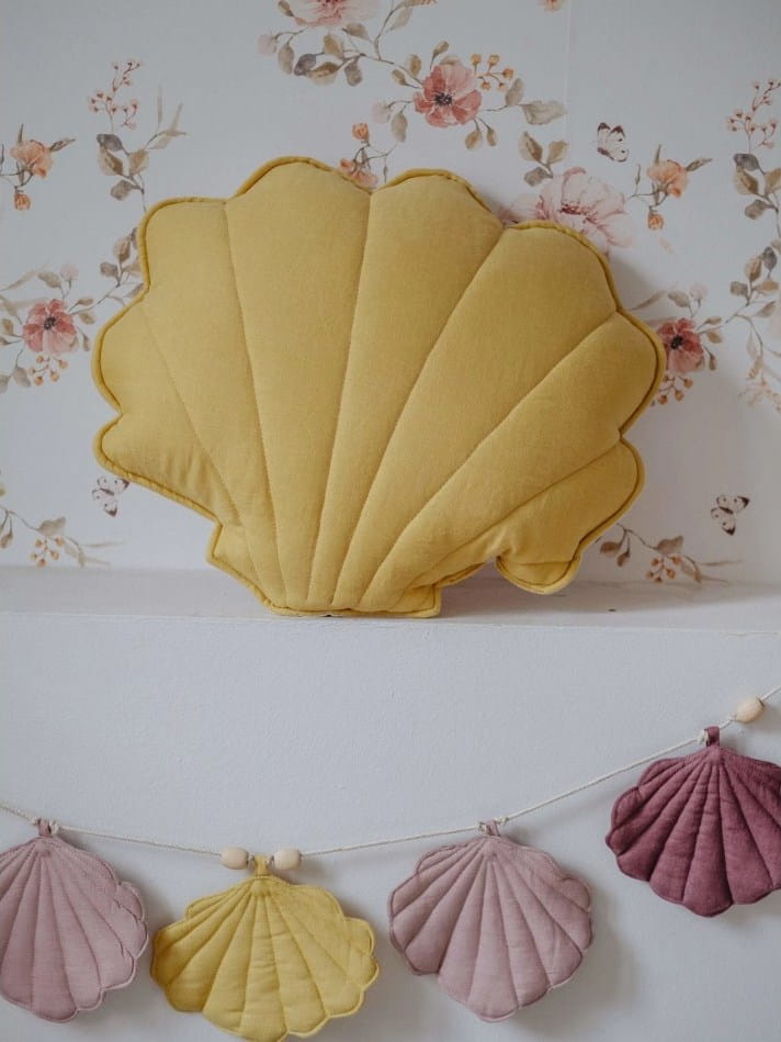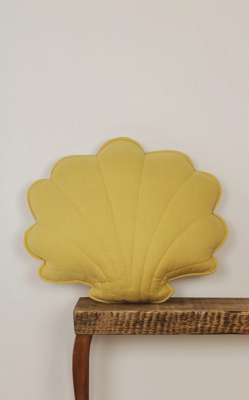 Poduszka lniana jest w kształcie muszli dostępnej w różnych wersjach kolorystycznych.
