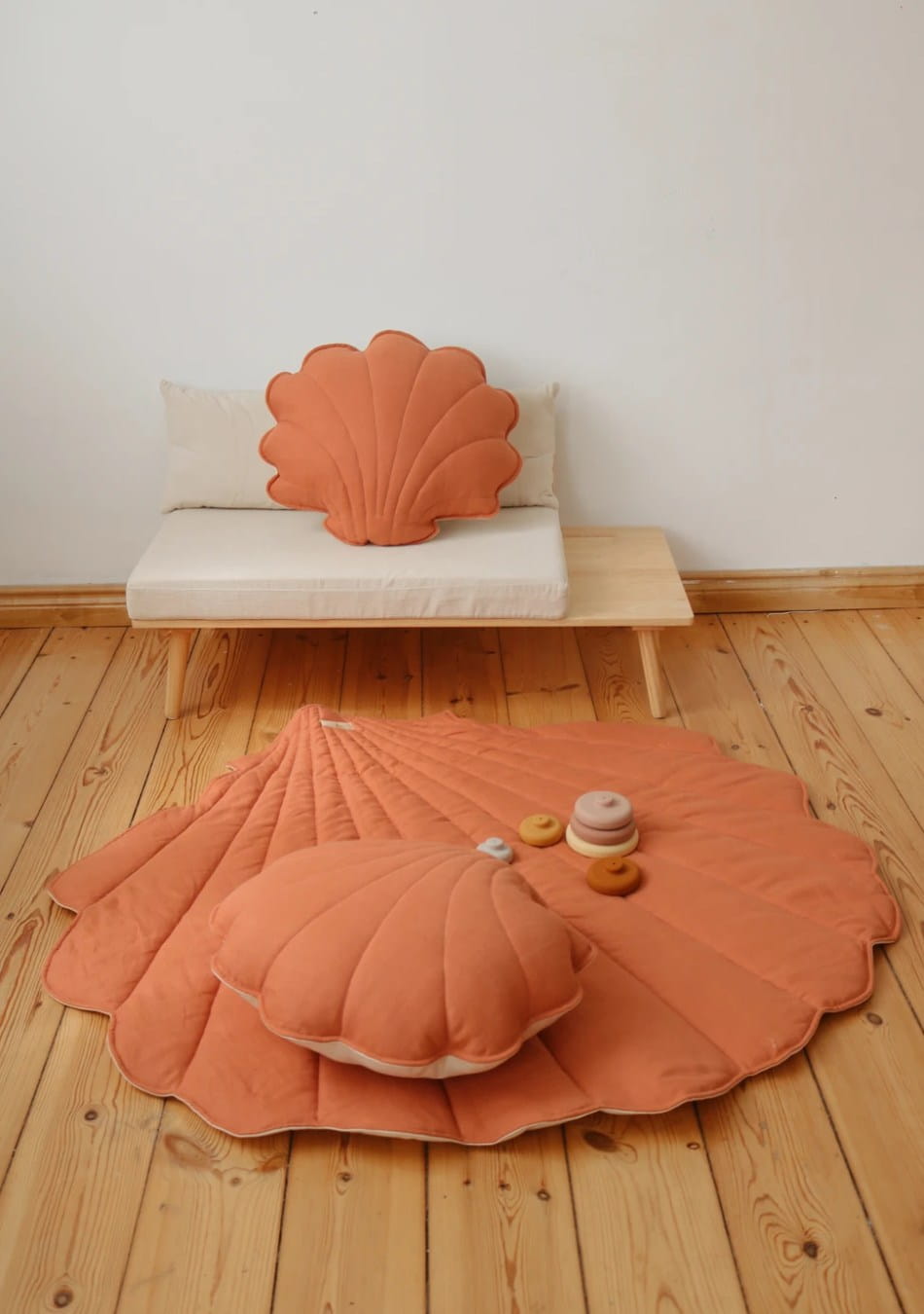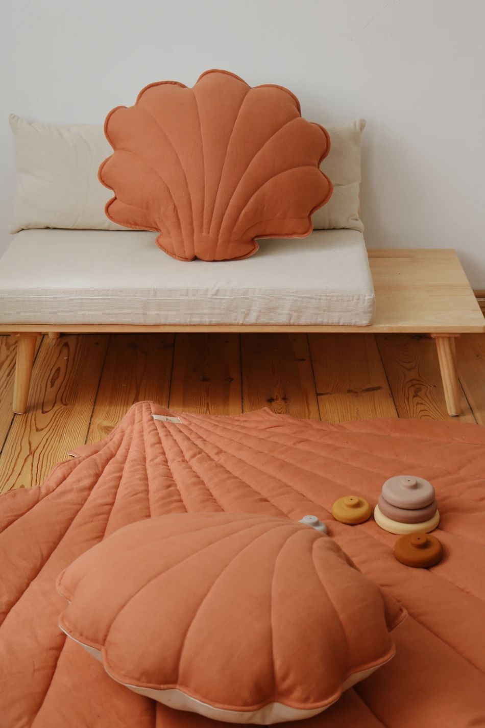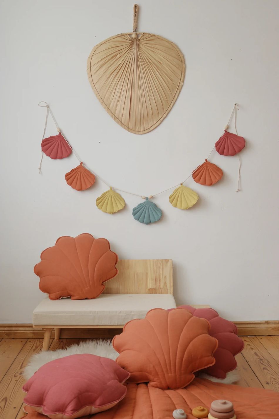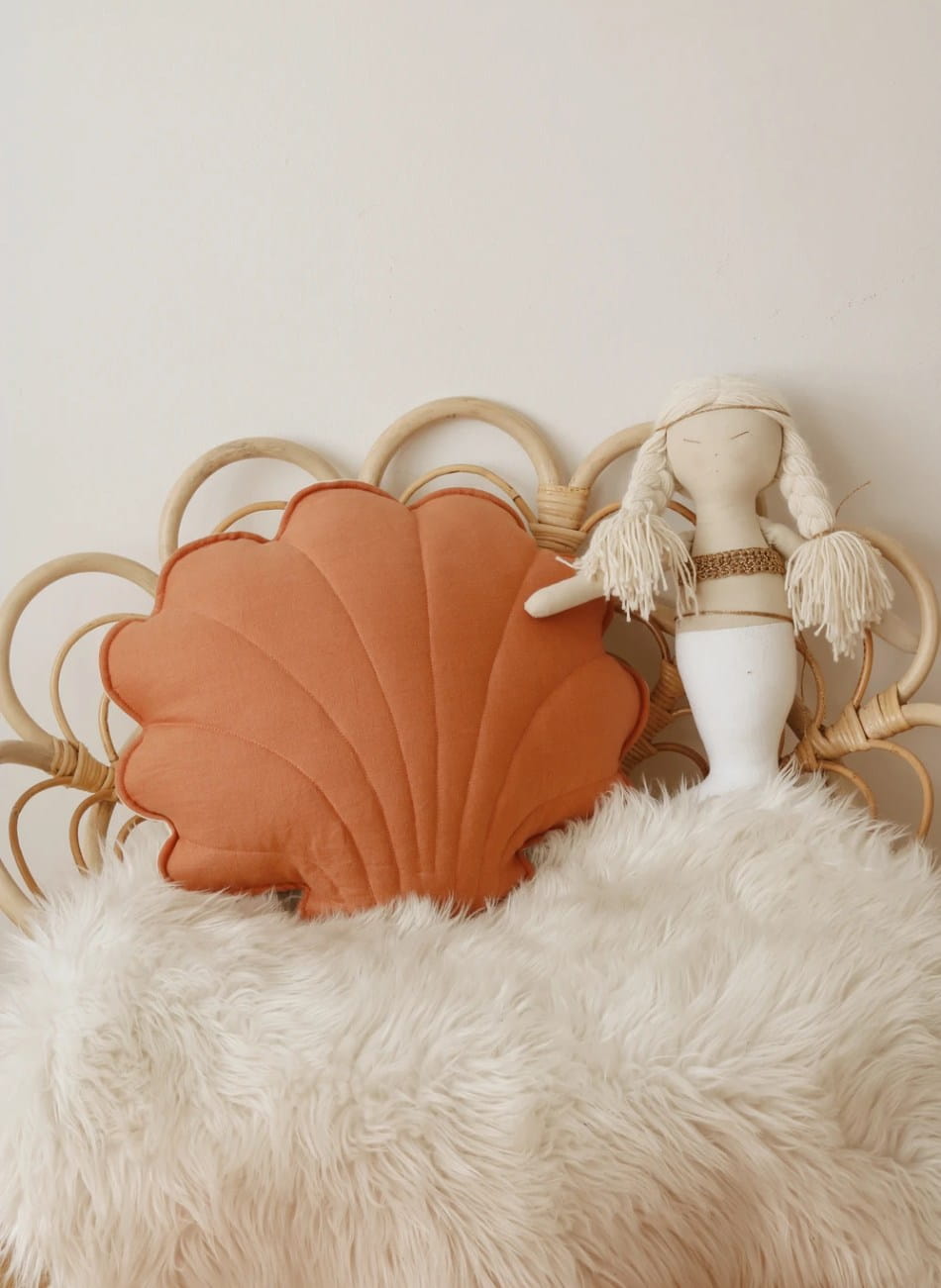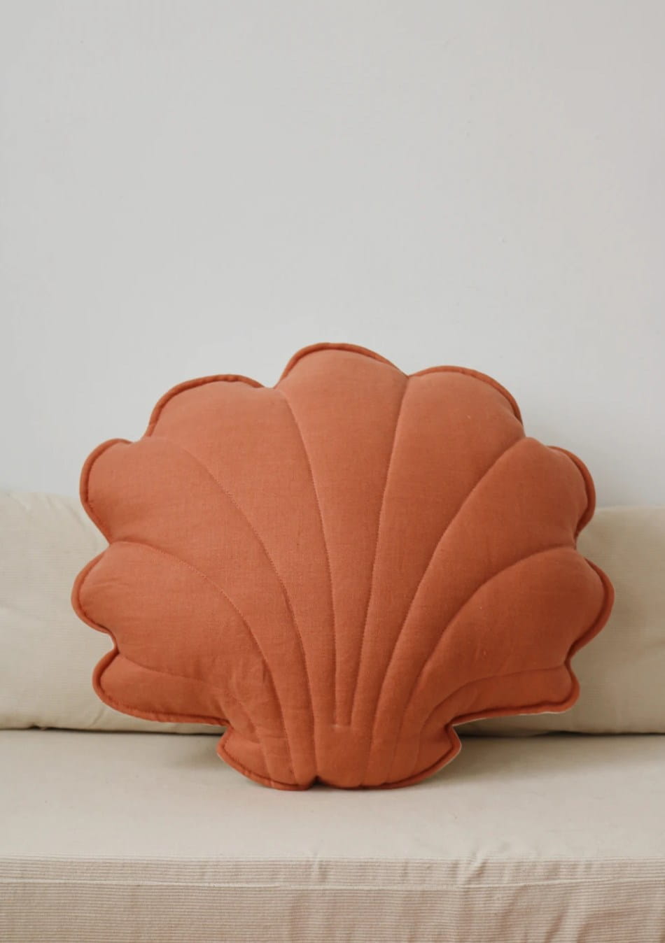 Poduszka lniana jest w kształcie muszli dostępnej w różnych wersjach kolorystycznych.