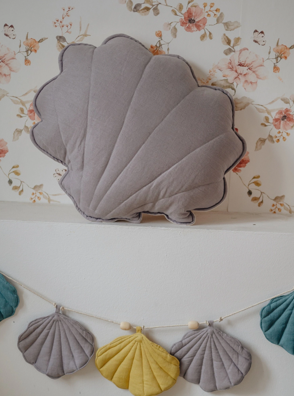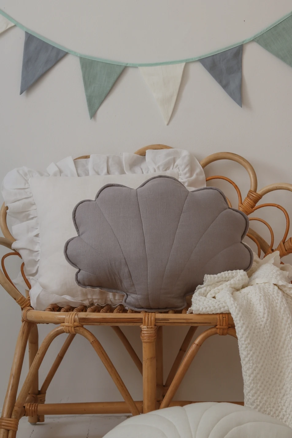 Poduszka lniana jest w kształcie muszli dostępnej w różnych wersjach kolorystycznych.