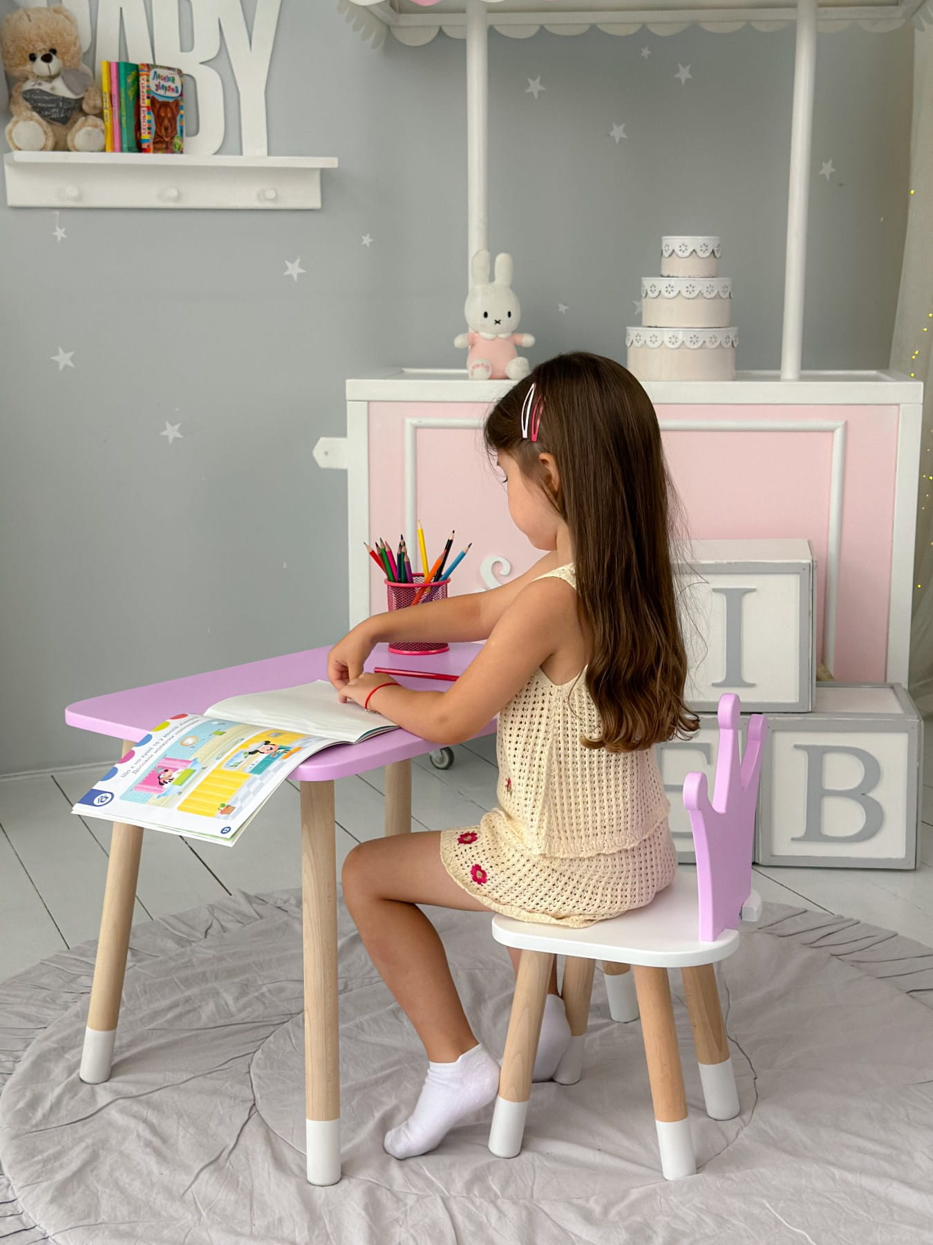 Wymiary stolika: 46x60x45 cm – idealnie dopasowany do dzieci w wieku 1,5–7 lat.