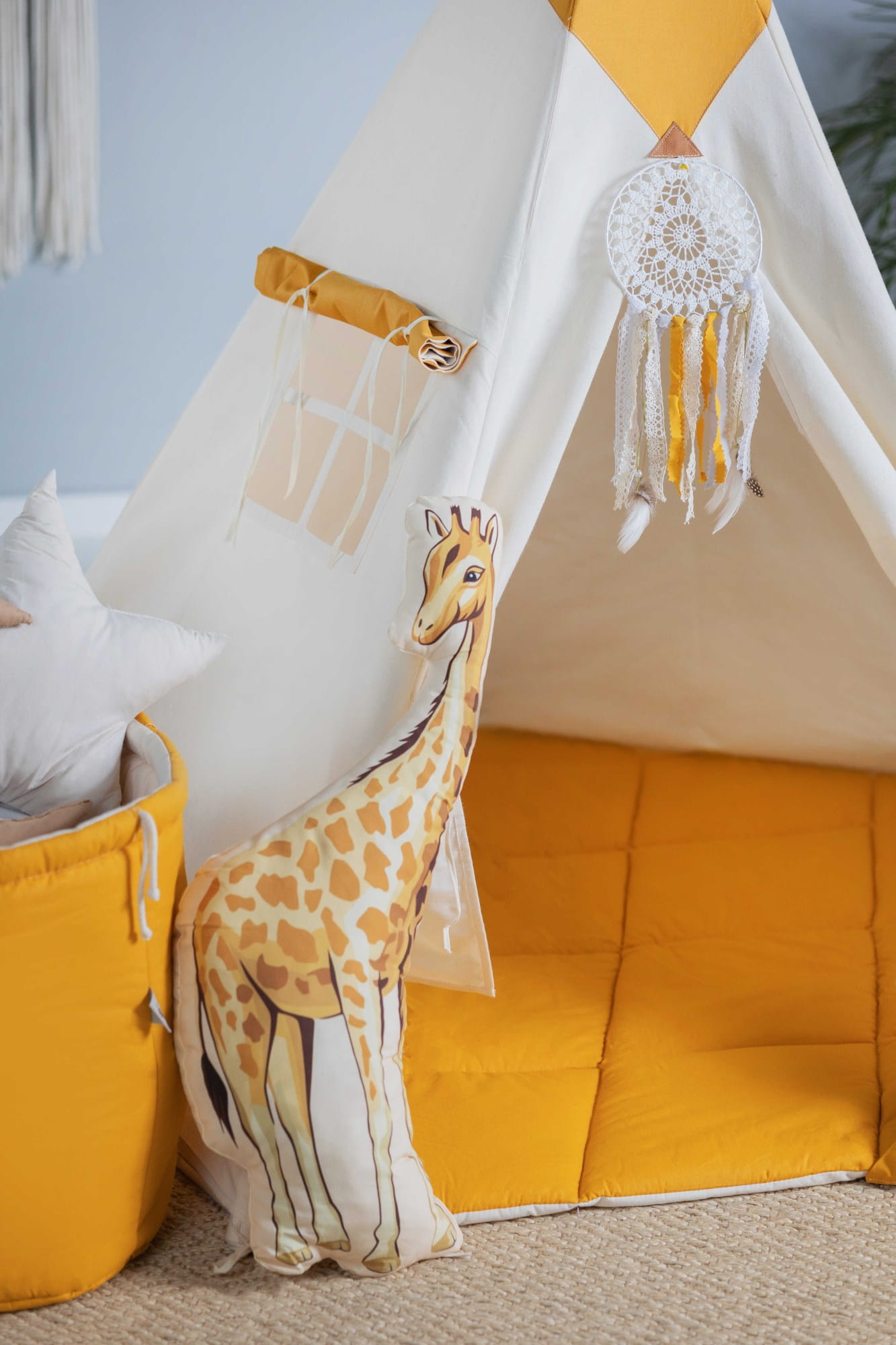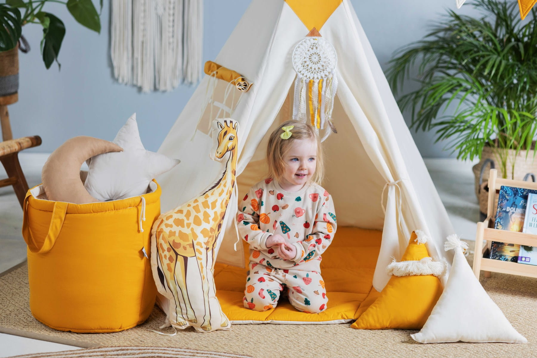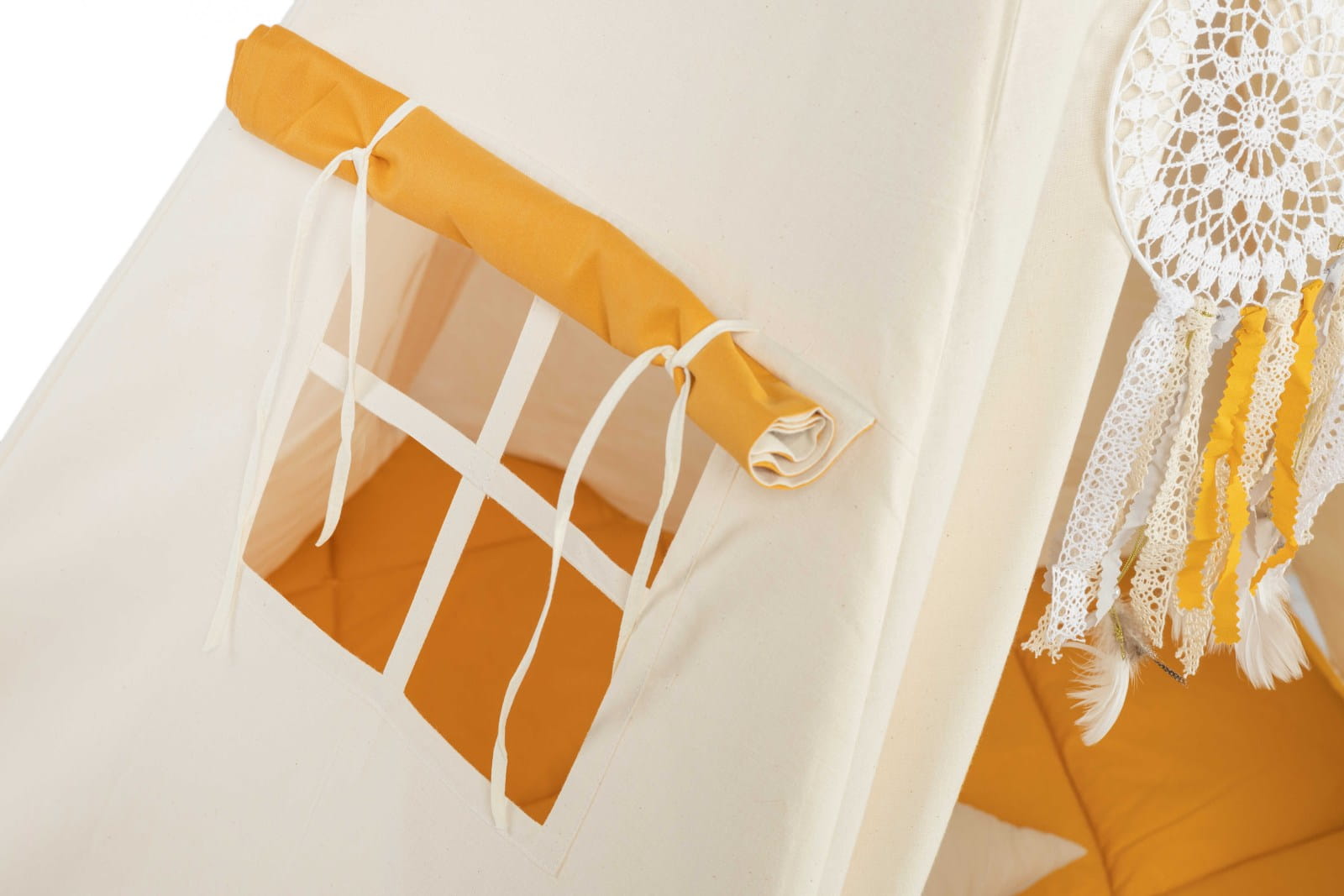 To pięknie udekorowane tipi, z jego żółtymi akcentami, stanie się idealnym azylem dla dziewczynki, gdzie może rozwijać swoją wyobraźnię, kreatywność i cieszyć się niezapomnianymi chwilami zabawy i odpoczynku.