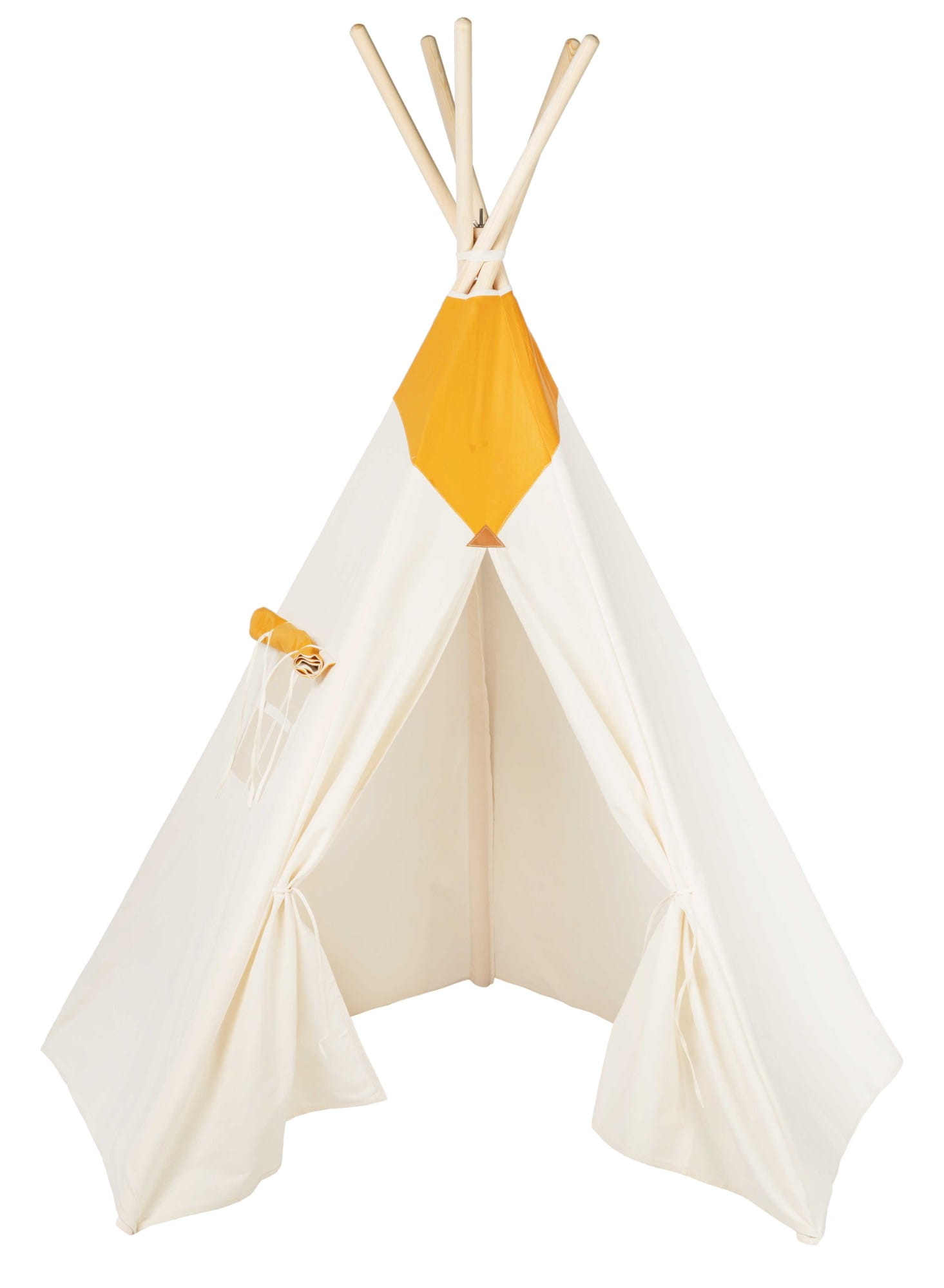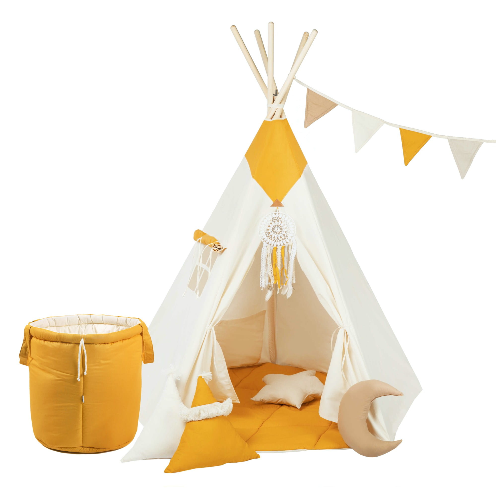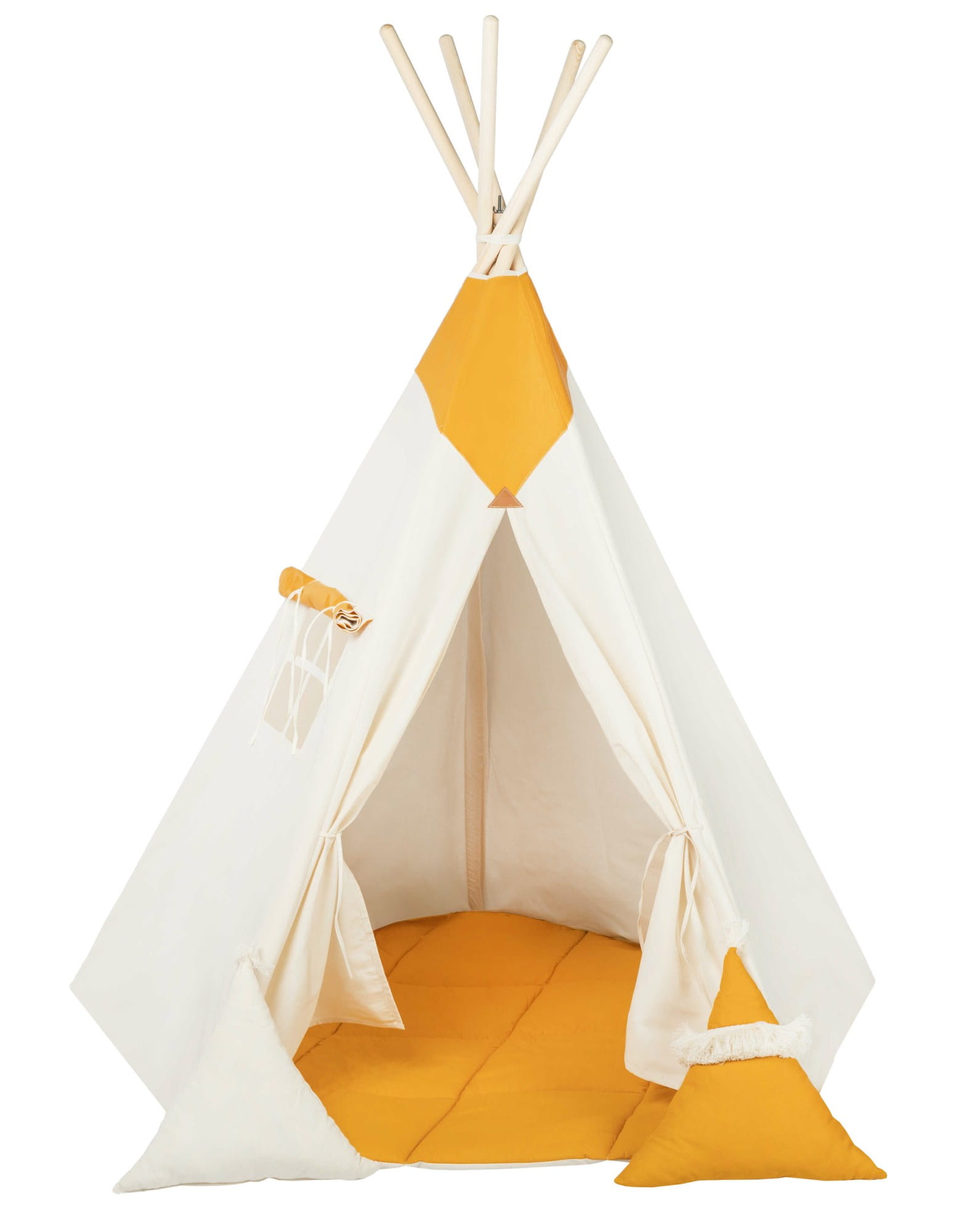 To pięknie udekorowane tipi, z jego żółtymi akcentami, stanie się idealnym azylem dla dziewczynki, gdzie może rozwijać swoją wyobraźnię, kreatywność i cieszyć się niezapomnianymi chwilami zabawy i odpoczynku.