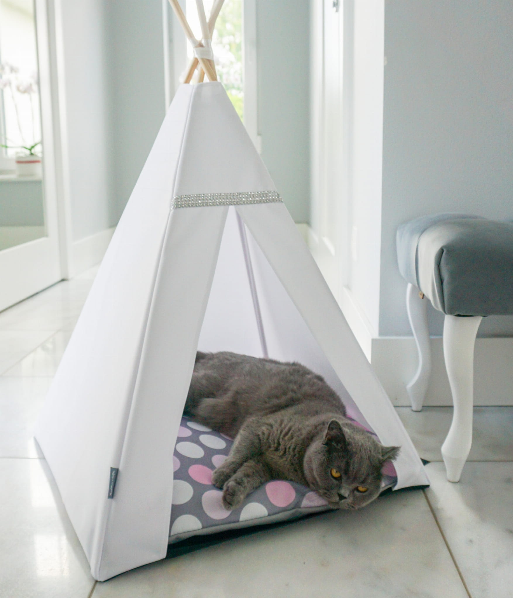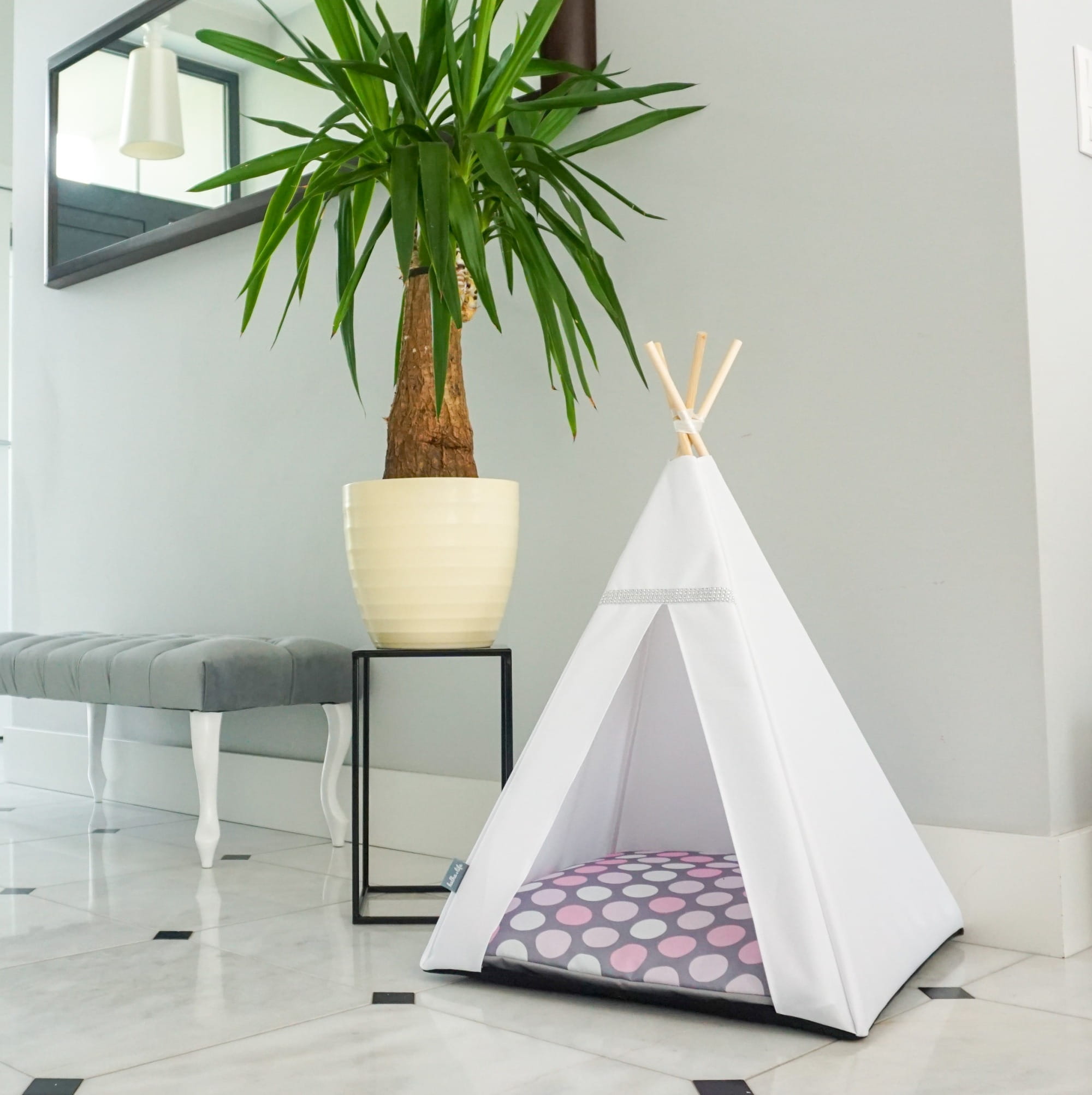 Legowisko jest wystarczająco miękkie a kształt i niewielki rozmiar tipi sprawi, że znajdziesz na nie miejsce nawet w niewielkim pomieszczeniu.